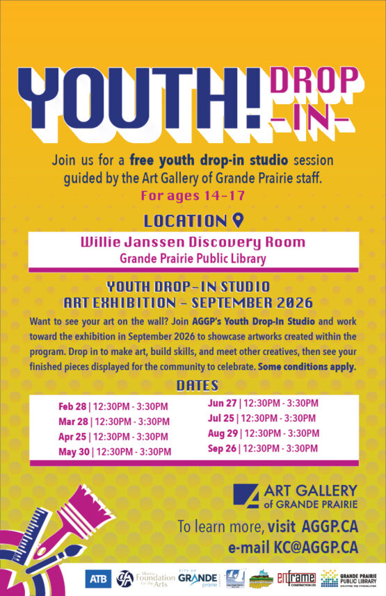 Youth Drop-In Studio Date: One Saturday each month Time: 12:30 pm to 1:30 pm Location: Art Gallery of Grande Prairie…