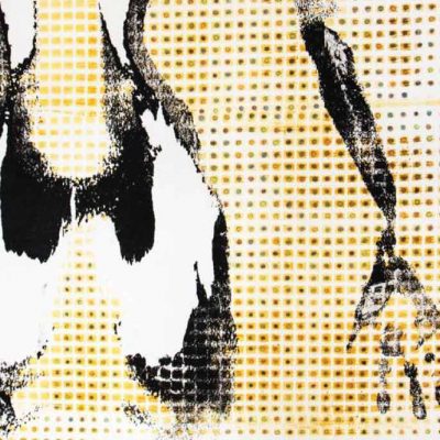 Mottishaw’s pieces include hand-stitched patterns meander across the canvas and fabric mimic walking paths she has visited in the area, translating those paths into traditional prints, and then focusing inward to the figure which walks those paths. The dangling thread ends suggest our sense of often feeling powerless in the face of change. The exuberance of nature and the concept that growth and flexibility are both possible when supported is illustrated through the use of rubber bands. The figures looks forward to the future, assuming the same stance as the viewer.