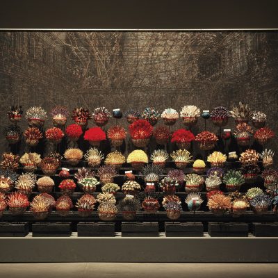 This exhibition is a mini retrospective with some of the work produced as early as 1997 (Spinners) to the most recent work (Curtain of Life, 2016 and some small sculptures that will be created in 2017 especially for this show). Earlier work demonstrates the searching for ideas that are individual and authentic and relate to the environment around our home in southwest Edmonton. In retrospect the themes of many of these works, such as Shoalwan: River of Fire, River of Ice, 2003 have become prescient issues for the global community. Organisms, 2012 and Curtain of Life, 2016, both included in this show continue to examine concerns about genetically modified organisms and the shrinking biodiversity of seeds.