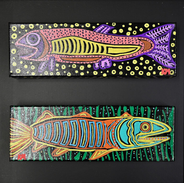 Featured Image : Katherine Moe, Pink, Yellow Fish | Orange, Blue Fish, Acrylic, Paint Pen on Canvas, 2024
