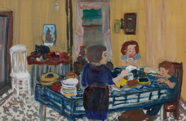 Helen Flaig was a self-described naïve painter who used acrylics and oils to paint everyday scenes of her life growing up on a farm in Saskatchewan. Her paintings are spontaneous and whimsical, full of colour and warmth, and reflect the games, play, and the work she shared with her siblings on their farm in the 1930’s. Flaig painted detailed scenes of everyday life; milking cows, shelling peas, and the careful production of washing dishes. She also captured her happy existence during that time, including kite-making, water fights, and riding to school in a horse-drawn cutter.